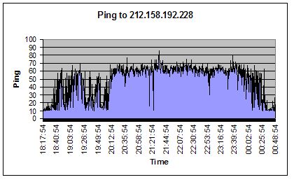 As you can plainly see the pings rise during peak time. However if thats STILL not enough evidence then examine this, I pinged the bulldog server 212.158.192.228 continually every 30s all evening, and surprise surprise, the exact same results. See them here: